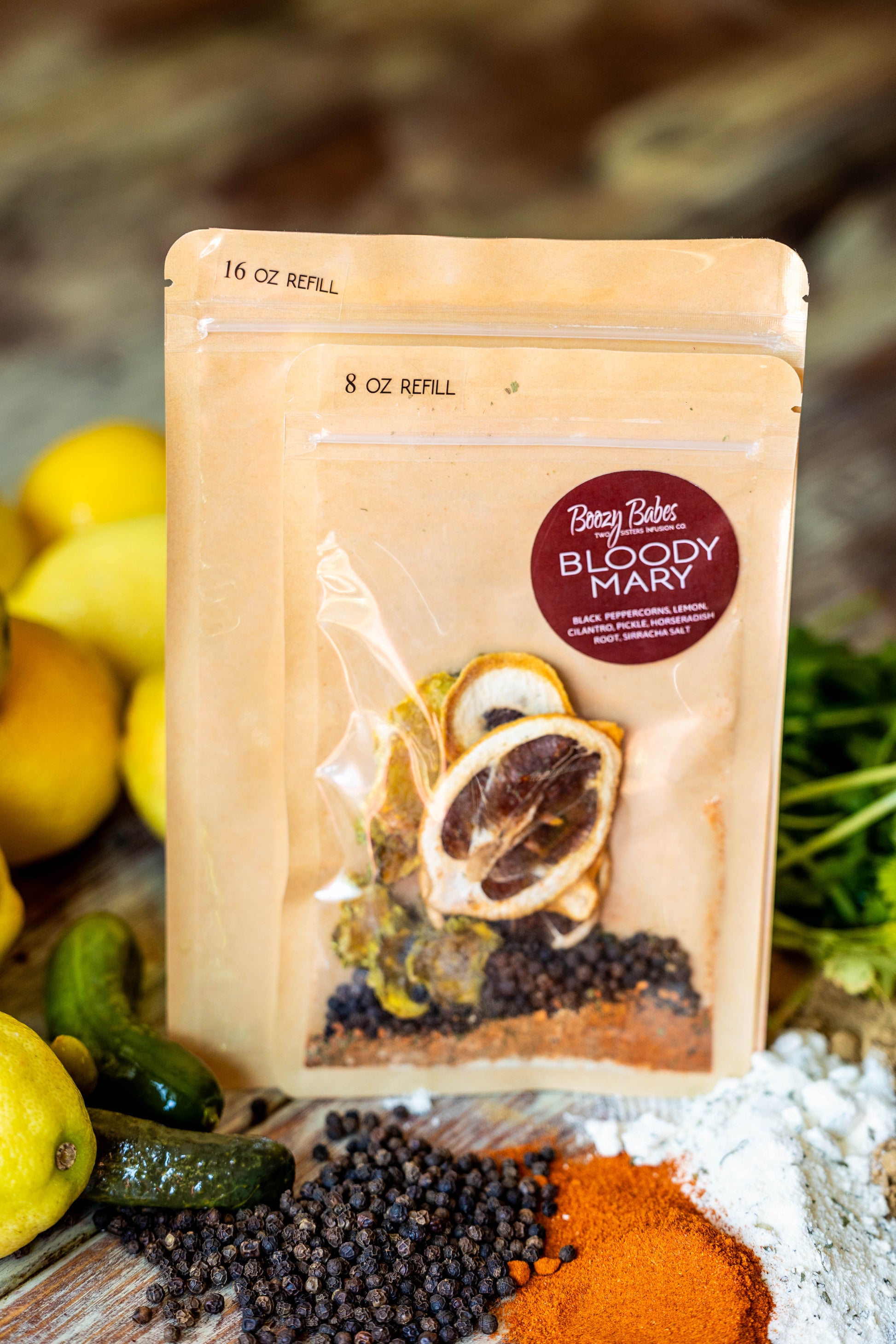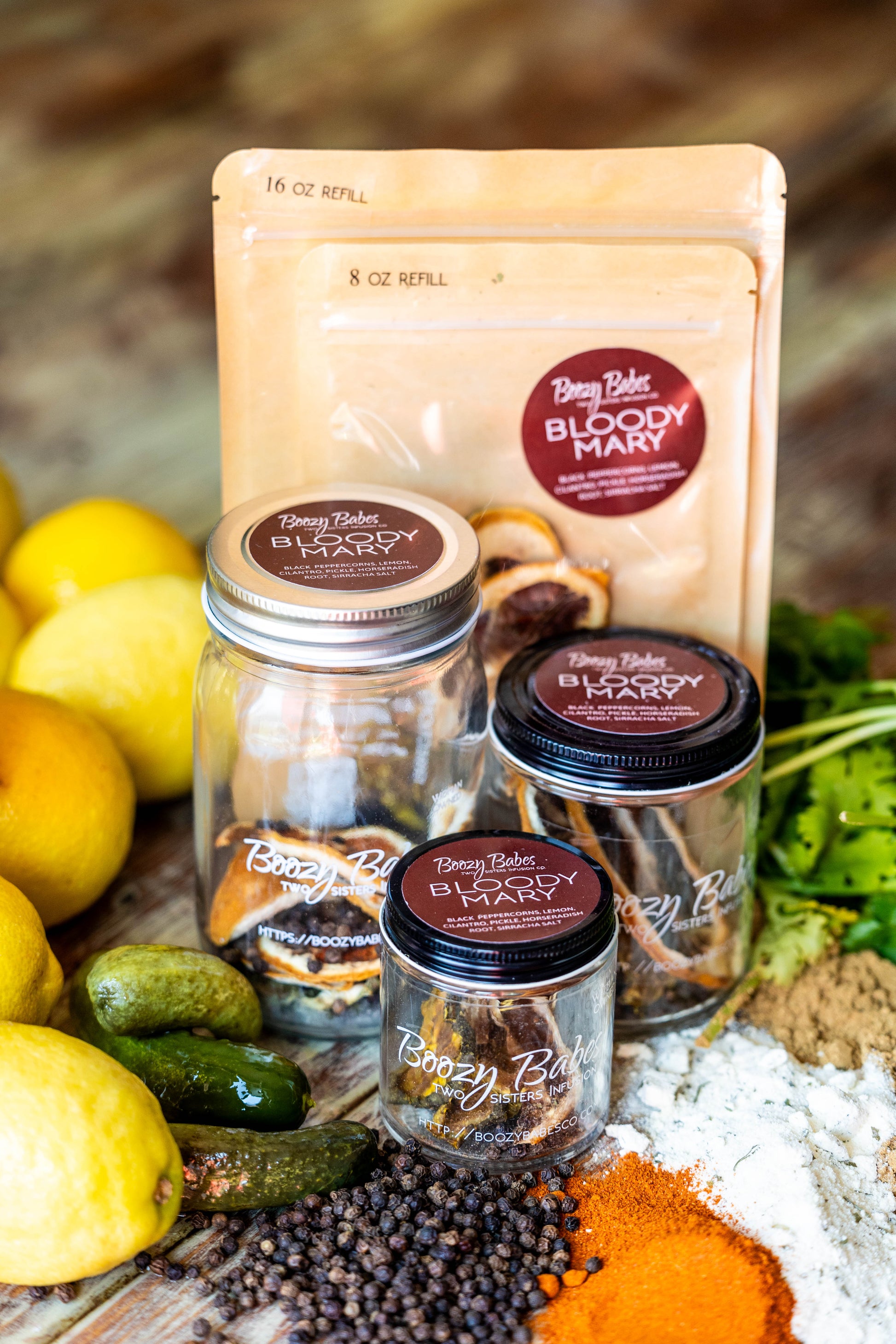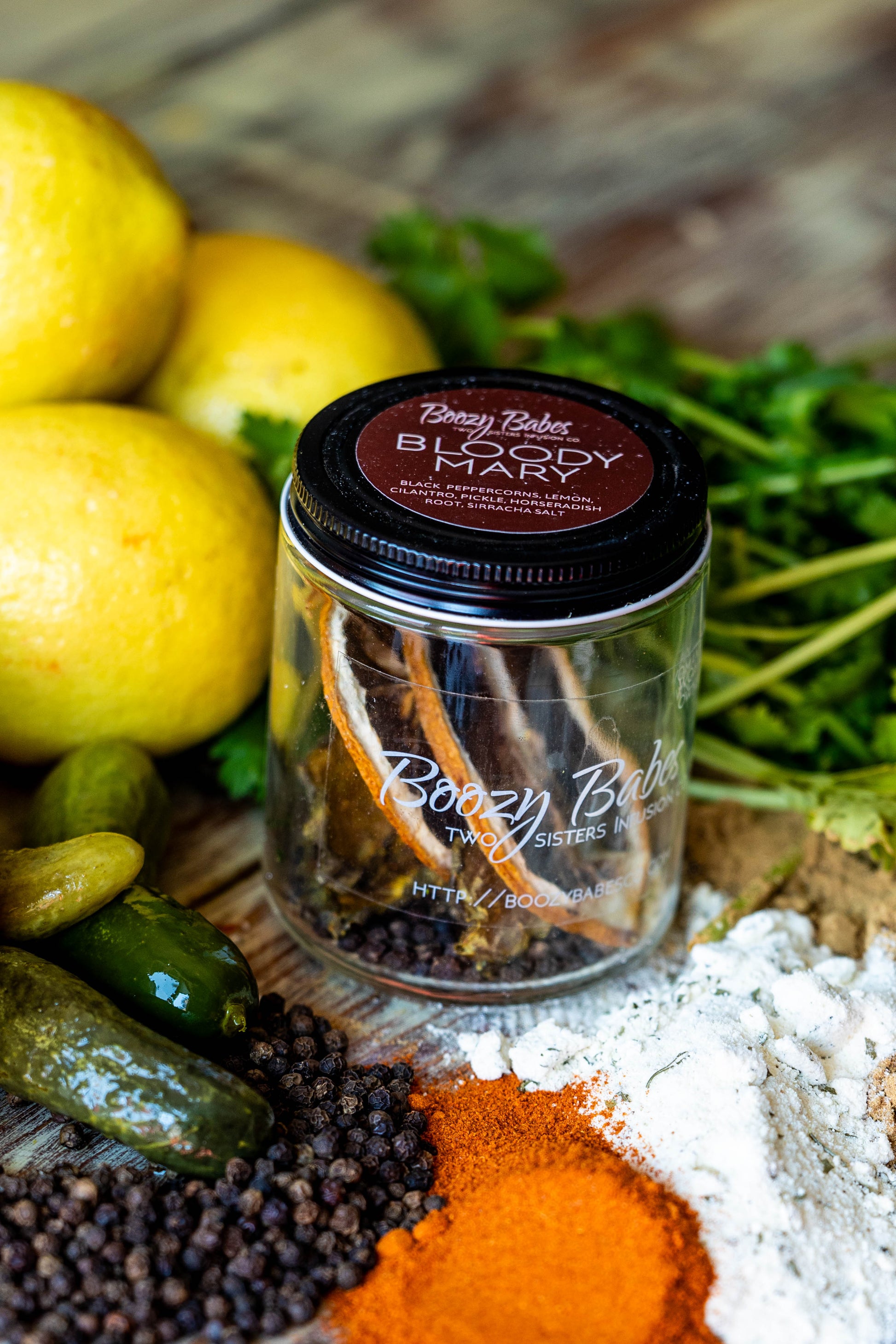 Boozy Babes Infusion Kit includes: Black Peppercorns, Lemon, Cilantro, Pickle, Horseradish Root, Siracha Salt & Spices