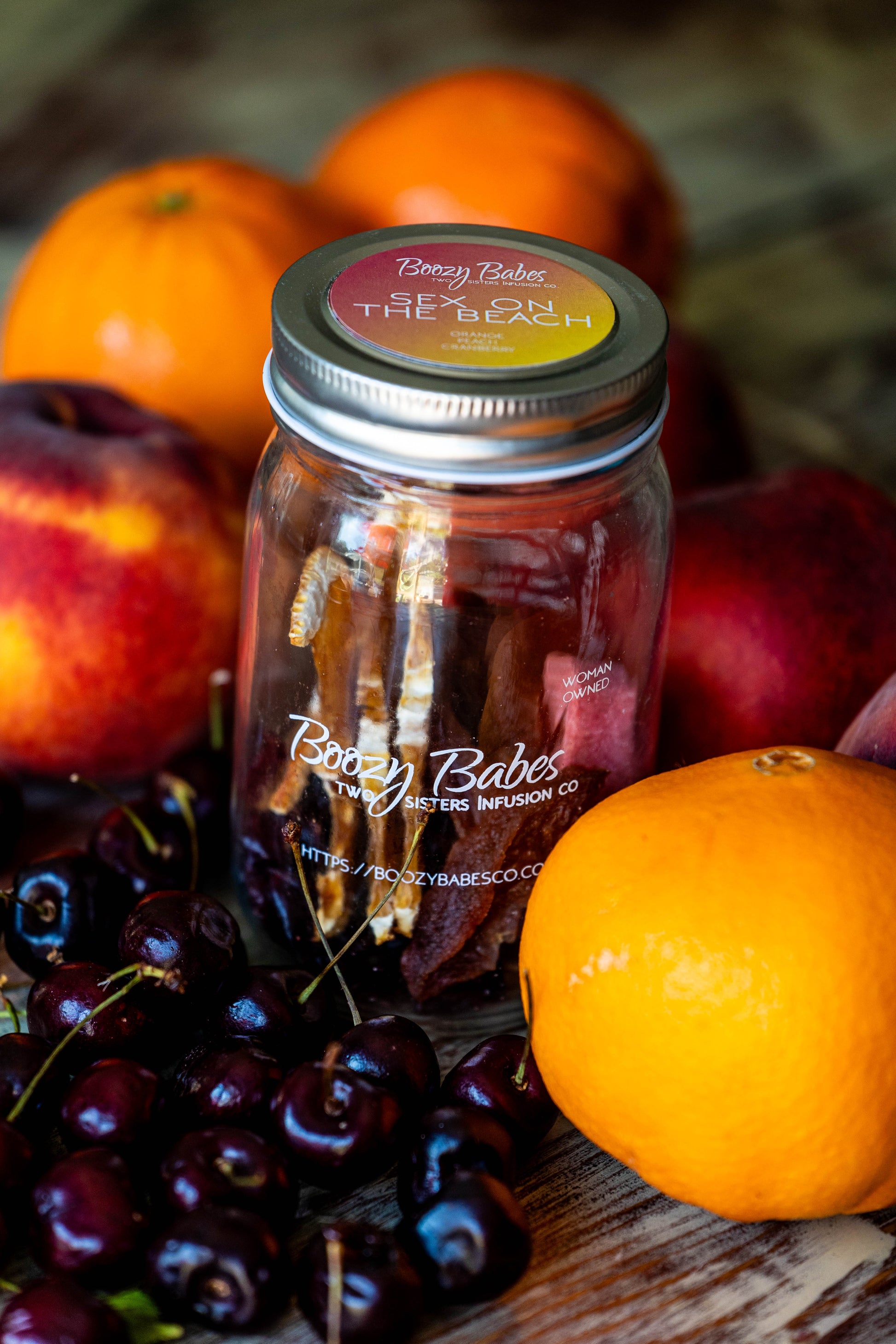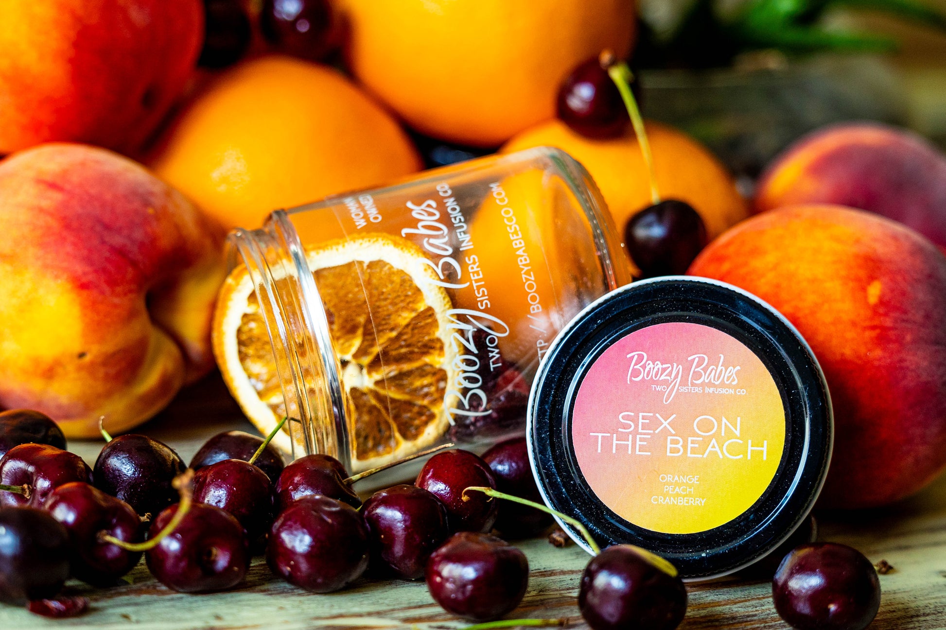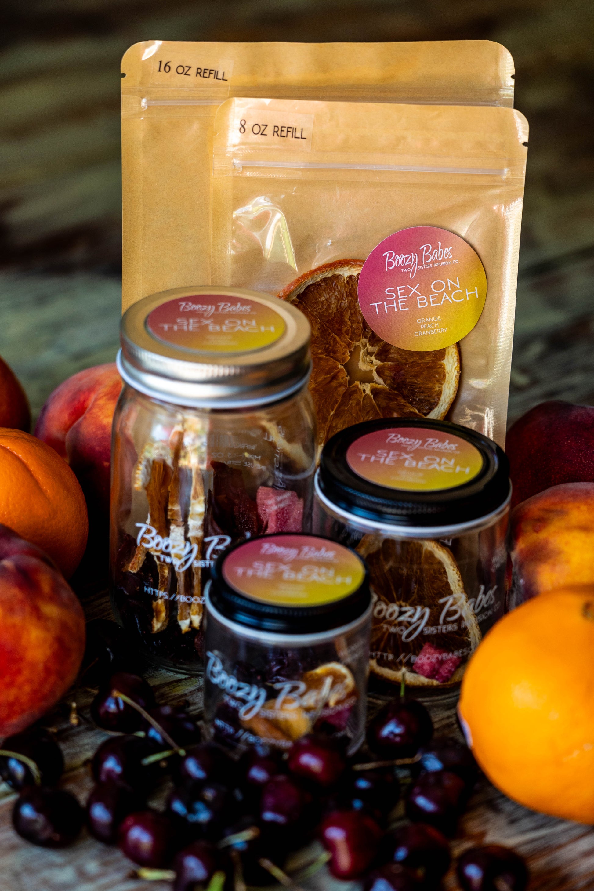 Boozy Babes Infusion Kit includes: Cranberries, Peaches, Oranges & Sugar.