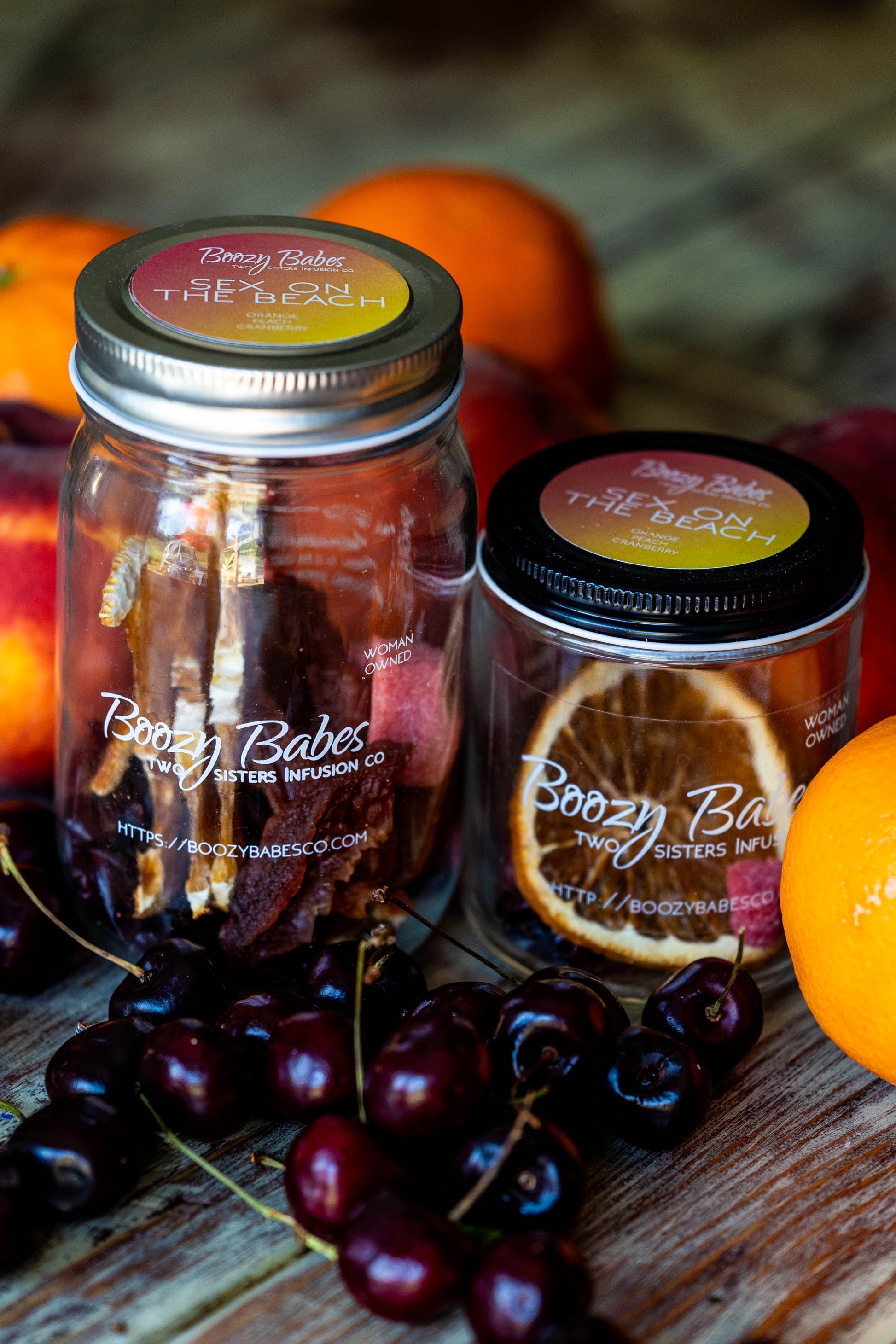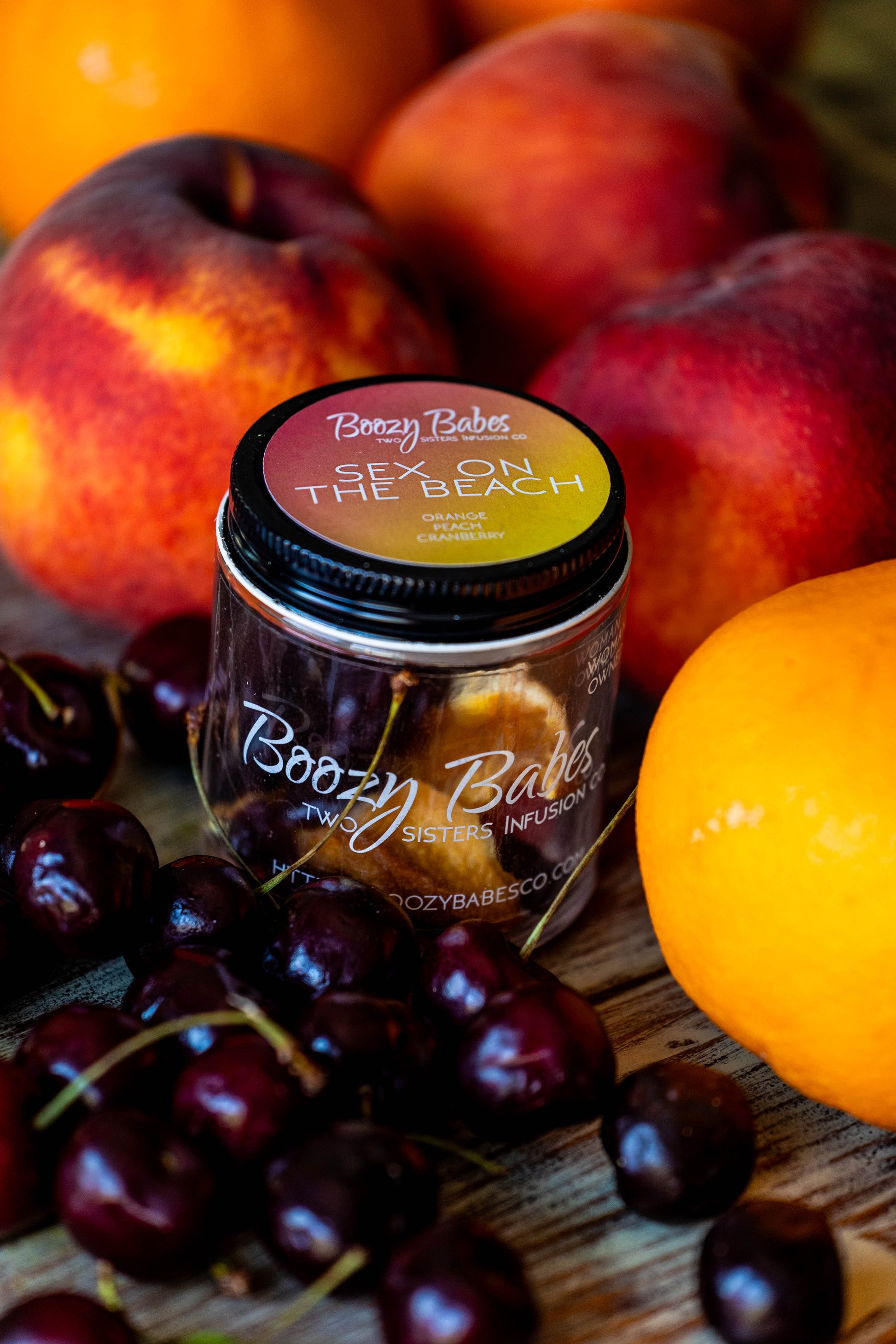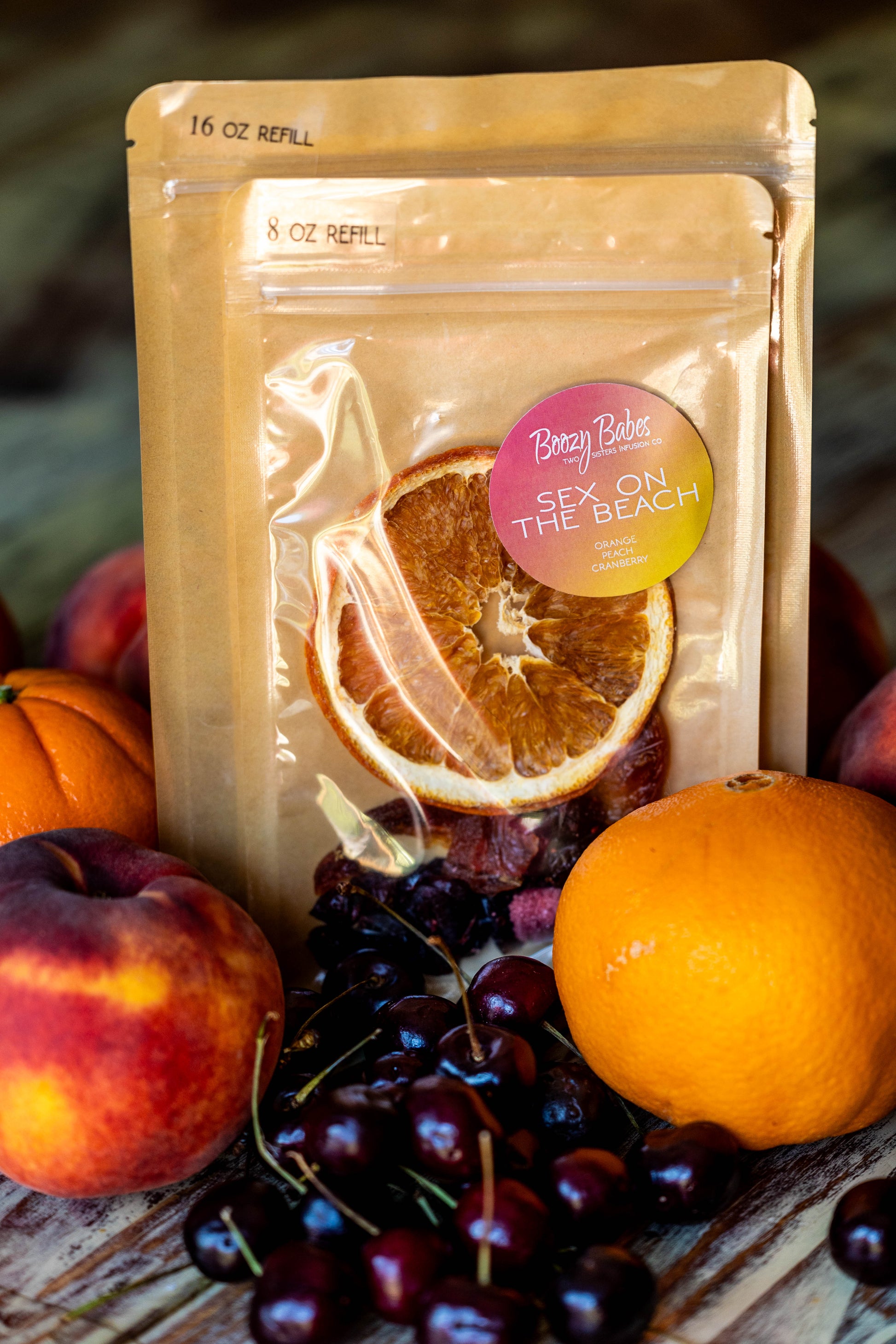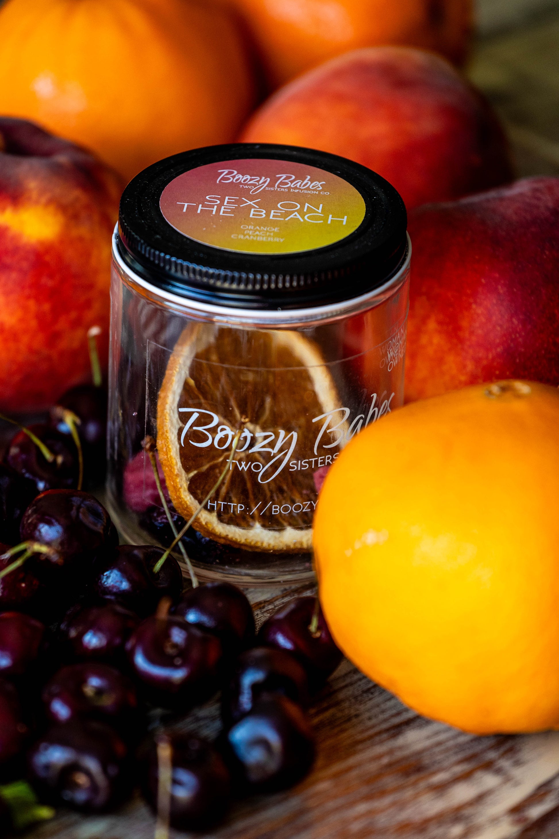 Boozy Babes Infusion Kit includes: Cranberries, Peaches, Oranges & Sugar.